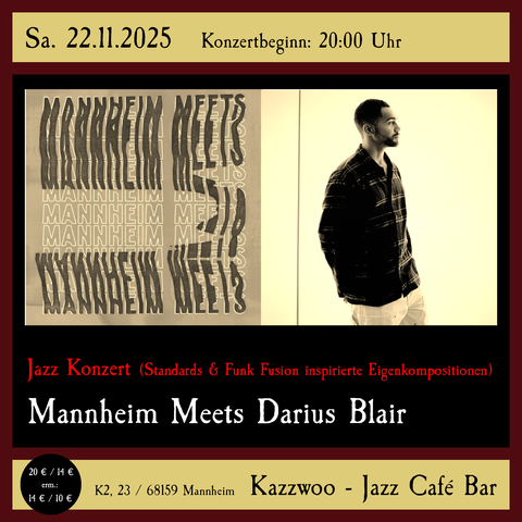 The band has invited Darius Blair to perform at the next Mannheim Meets event. Darius Blair was born in Wiesbaden in 2002 and grew up in the Rhine-Main region. In 2018, he won first prize in the solo and combo competition at the Jugend jazzt event in Hesse, and in 2019, at the national competition of the same event, he won the WDR Big Band Soloist Prize, among others. In 2020, he was awarded the prestigious Frankfurt Jazz Scholarship—the youngest recipient to date at the age of 18.In his quartet and other projects, he combines his own compositions with reinterpreted jazz standards, focusing on improvisation and interaction with other musicians.